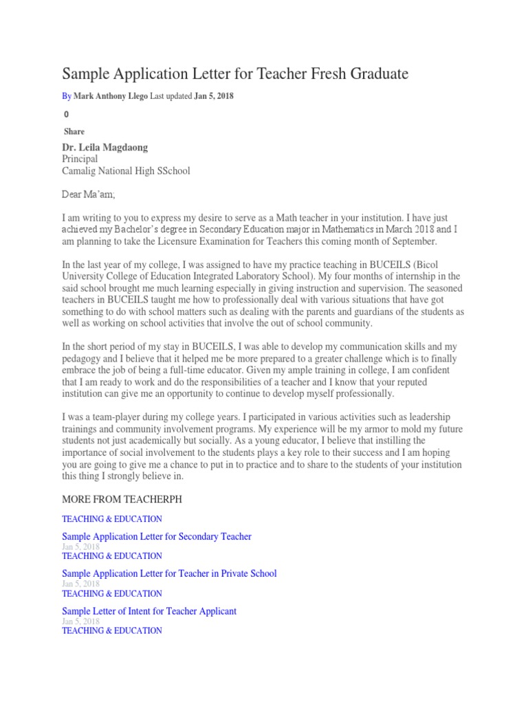 As you can see, application letter for teacher fresh graduate writings tran has some parts that you need to include when you write the letter. Dear dean, i, jon smith writing this email to apply for the position of teacher. Teaching assistant cover letter experience job and ideas example intended for application letter for teacher fresh graduate. These various teacher application letters' selections include individuals focusing on elementary education, special education, substitute teaching, and below you will find excerpts from the various sections that make up the sample application letters for teacher positions: Sample application letter for teacher fresh graduate teacherph. I saw your advertisement regarding the requirement of an assistant teacher. / 6+ sample job application letters for teachers. If you're writing a reference letter for someone applying for a teaching job, then you've. But with an impressive application letter even a fresh graduation can apply for any position and be successful. Home » deped hiring process » sample application letter for teacher fresh graduate. I have just achieved my bachelor's degree in secondary education major in mathematics in march 2018 and i am planning to take the licensure examination for teachers this coming month of september. This letter is what will set you apart from other candidates, and give you a chance at showcasing the skills you have. Learn to create a personalized application letter for teacher job for fresher using the sample template.